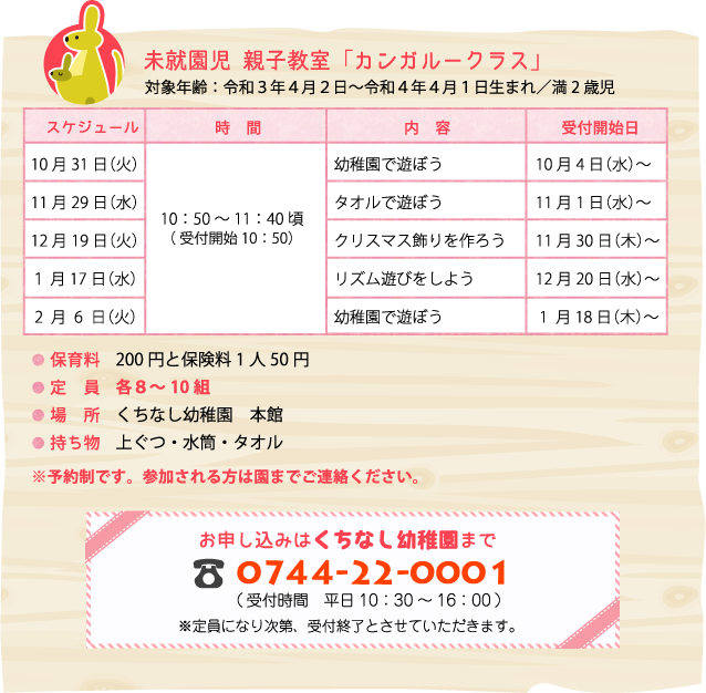 くちなし幼稚園では、幼稚園に通う前のお子様を対象に、親子で参加できる未就園児親子教室を実施します。お子様とゆったりとした時間を過ごし、また保護者同士の交流の場として、足を運んでみてくださいね。