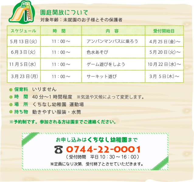 くちなし幼稚園では、未就園のお子様と保護者の方を対象に園庭開放を実施します。